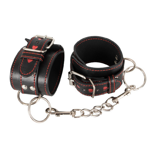 The leather-look of the handcuffs is decorated with red stitching and small, punched out red hearts, ensuring endless seduction and excitement. There is also a practical buckle for easily cuffing your partner into submission. The short connection chain with snap hooks will restrict the wearer’s hands and satisfy the BDSM enthusiast's lust for bondage.